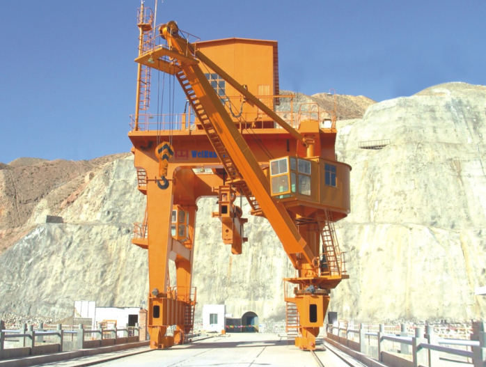 雙向雙回轉門機與雙向門機類似。大車沿壩體方向運動,小車沿水流方向運動。一般配有多套抓梁,可對壩上不同中心線上的多孔閘門及攔污柵進行啟閉。門機上游或者下游支腿均配有回轉吊,每個回轉吊回轉半徑可達180°,可以輔助壩上設備的運輸與安裝。